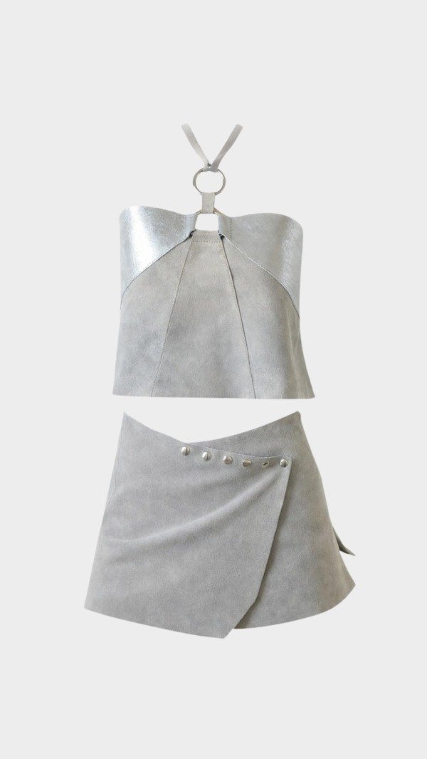 Pollera de cuero gamuza. Rústica y asimétrica. Con broches de ajuste en distintas medidas.
